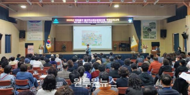 (원투원뉴스) 인천 미추홀구 지역사회보장협의체는 17일 구청 대회의실에서 협의체 위원과 담당 공무원 200여 명을 대상으로 ‘2026년 동지역사회보장협의체 역량 강화교육’을 개최했다.