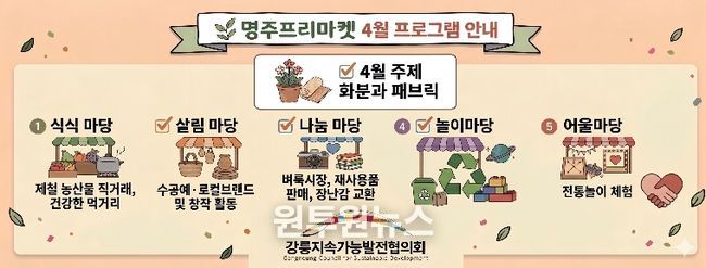(원투원뉴스) 강릉지속가능발전협의회(상임회장 김태경)가 주최·주관하는 '2026년 4월 명주프리마켓'이 오는 18일 11시부터 16시까지 강릉 대도호부 관아에서 개최된다.