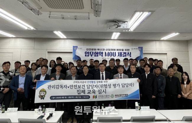 (원투원뉴스) 구미도시공사는 대한산업안전협회와 산업현장 안전문화 확산 및 근로자 산업재해 예방을 위한 업무협약(MOU)을 체결하고, 안전 중심의 경영체계 구축을 위한 협력에 나섰다.