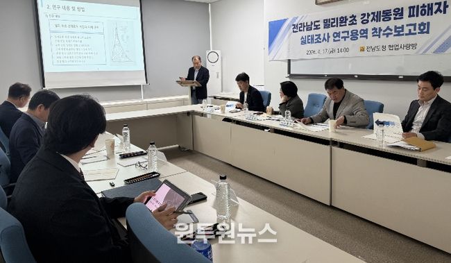 (원투원뉴스) 전라남도는 일제 강제 동원 피해 진상규명과 국가 차원의 보상지원 건의를 위해 17일 도청에서 밀리환초 강제 동원 피해자 실태조사 연구용역 착수보고회를 개최했다.
