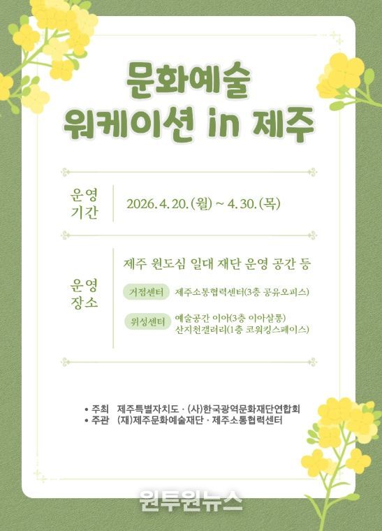 (원투원뉴스) 제주특별자치도와 한국광역문화재단연합회가 주최하고 제주문화예술재단(이사장 김석윤)이 주관하는 2026년 ‘문화예술 워케이션 in 제주’ 1차 프로그램이 오는 20일부터 4월 30일까지 운영된다.