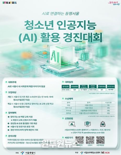 (원투원뉴스) 서울시는 청소년이 인공지능(AI)을 활용해 지역사회 문제해결 아이디어를 제안하고 이를 공공정책으로 연결하는 '2026 청소년 인공지능(AI) 활용 경진대회'를 개최하고 4월 30일까지 참가자를 모집한다.