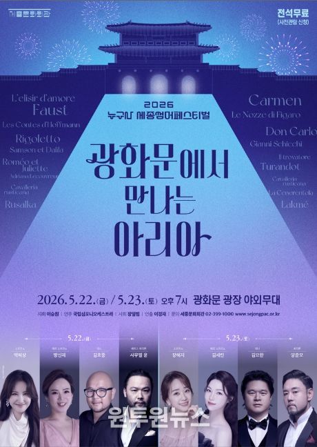 (원투원뉴스) 세종문화회관은 서울시민 누구나 즐길 수 있는 세종 썸머 페스티벌 '광화문에서 만나는 아리아'를 오는 5월 22일과 23일, 양일간 광화문 광장에서 개최한다. 광화문 광장은 시민 중심의 공간으로 새롭게 거듭난 이후 서울을 대표하는 문화 명소로 자리해 왔으며, 그 중심에서 세종문화회관은 한국 문화예술을 상징하는 공간으로 자리해 왔다. 이러한 공간적 맥락 속에서 세종문화회관과 광화문 광장은 문화의 전통성과 동시대성을 함께 품은 열린 문화예술 플랫폼으로 그 의미를 확장해가고 있다.