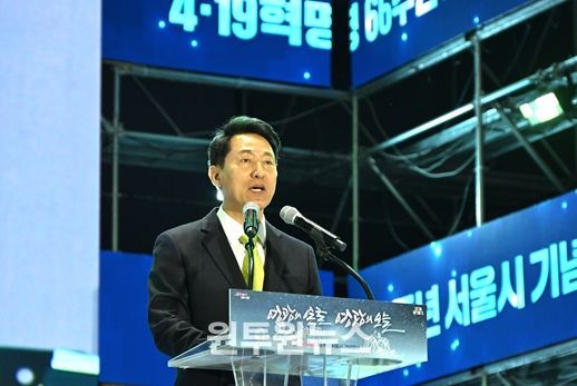 (원투원뉴스) 오세훈 서울시장은 18일 오후 7시 광화문광장 육조마당에서 열린 ‘4‧19혁명 66주년 서울시 기념행사’에 참석했다.