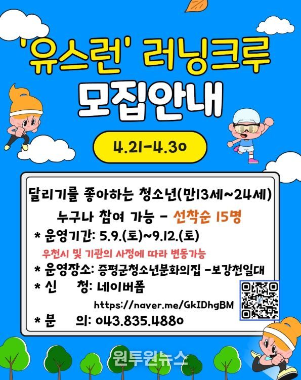 (원투원뉴스) 충북 증평군청소년문화의집이 청소년들이 직접 기획하고 운영하는 주도형 러닝크루 ‘유스런 러닝크루’를 모집한다.