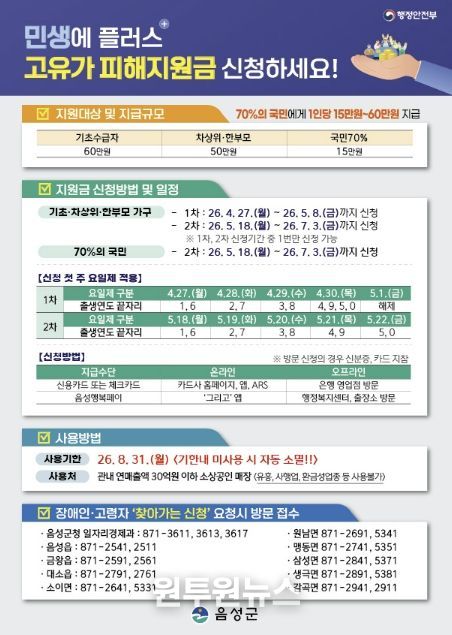 이번 지원금의 지급 대상은 올해 3월 30일 기준, 70%의 국민에게 소득 수준과 거주 지역에 따라 차등 지급한다. 특히 음성군은 비수도권으로 기초수급자 60만원, 차상위 및 한부모 50만원, 소득하위 70% 군민은 1인당 15만원을 지급받는다.