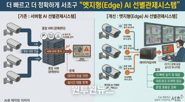 (원투원뉴스) 서울 서초구가 전국 최초로 ‘엣지형 AI 선별관제시스템’을 도입해 본격 운영에 나선다고 밝혔다. AI 카메라가 현장에서 영상을 직접 분석한 뒤 선별된 정보를 관제센터로 전송하는 방식으로, 범죄·재난 등 비상상황 대응 속도와 관제 효율을 높인다는 계획이다.