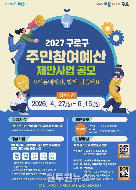 (원투원뉴스) 구로구가 2027년 예산에 편성할 ‘주민참여예산 사업 공모’를 4월 27일부터 6월 15일까지 진행한다.