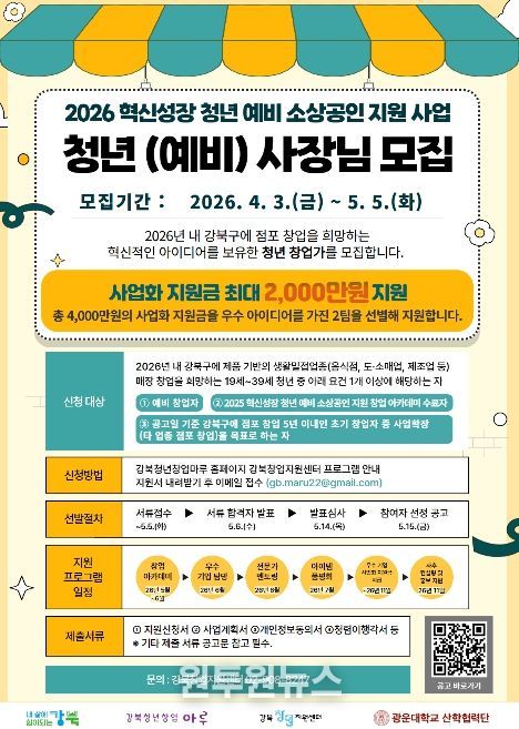 (원투원뉴스) 서울 강북구는 청년 창업 활성화와 지역 상권 경쟁력 강화를 위해 ‘2026년 혁신성장 청년 예비 소상공인 지원사업’ 참여자를 모집한다고 밝혔다.