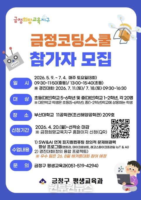 (원투원뉴스) 부산 금정구는 초‧중학생을 대상으로 인공지능(AI) 및 소프트웨어(SW) 교육 프로그램인 녪금정 코딩스쿨’을 운영한다고 밝혔다.