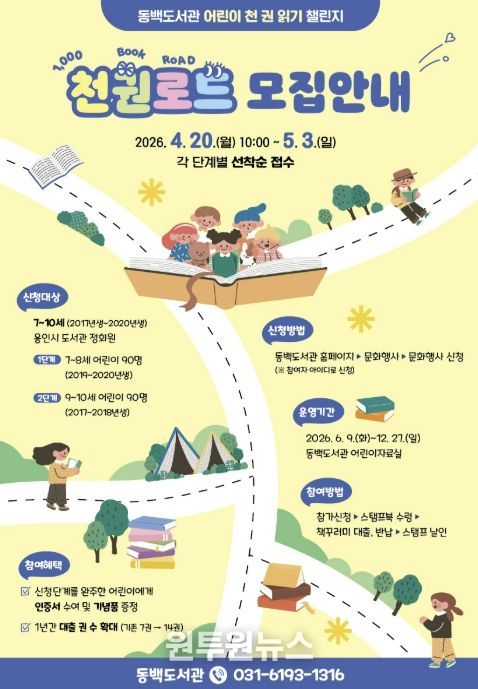 (원투원뉴스) 용인특례시 동백도서관은 어린이 천 권 읽기 챌린지 ‘천권로드(ROAD)’ 참여자를 모집한다고 20일 밝혔다.