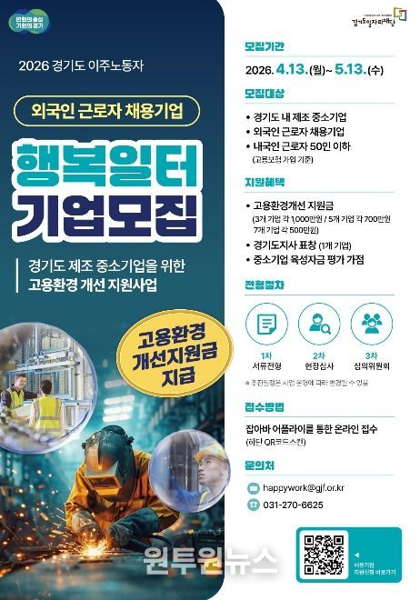 (원투원뉴스) 경기도와 경기도일자리재단은 도내 외국인 근로자를 고용한 중소 제조기업을 대상으로 ‘2026년 경기도 이주노동자 행복일터 선정사업’ 참여기업을 모집한다고 20일 밝혔다.