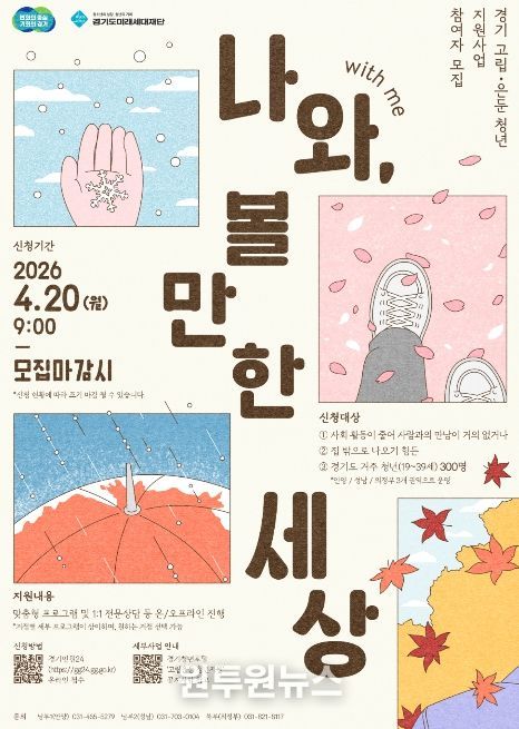(원투원뉴스) 경기도가 사회적 관계가 단절된 고립·은둔 청년의 일상 회복을 돕기 위해 20일부터 ‘경기 고립·은둔 청년 지원사업: 나와(with me), 볼만한 세상’ 참여자 300명을 모집한다.