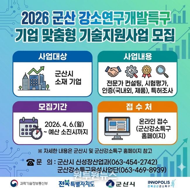 (원투원뉴스) 군산시는 관내 기업의 기술 경쟁력 강화를 위해 ‘2026년 군산 강소연구개발특구 기업 성장단계별 기술지원사업’을 본격 추진한다고 밝혔다.