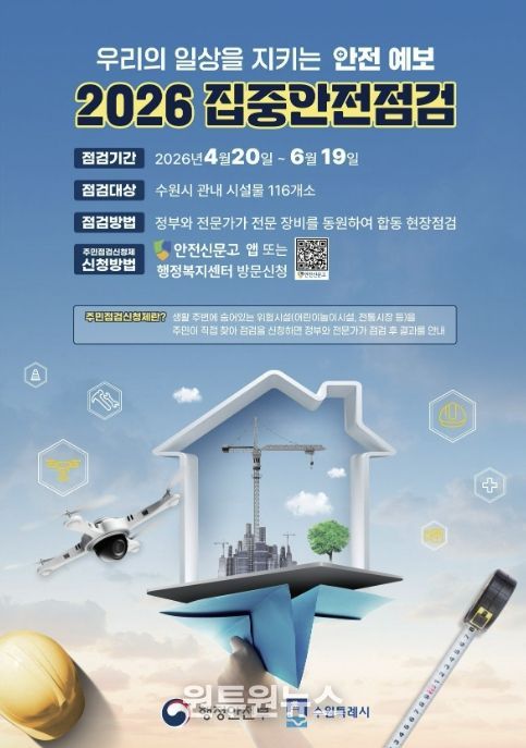 (원투원뉴스) 수원특례시가 안전사고를 예방하고, 시민의 안전 의식을 고취하기 위해 20일부터 6월 19일까지 ‘2026년 집중안전점검’을 한다.