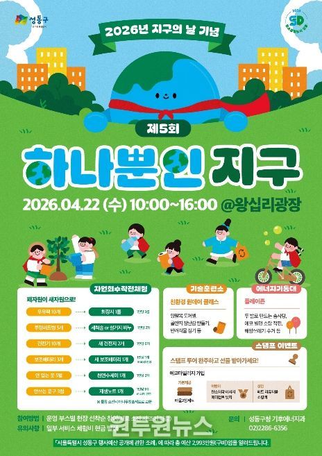 (원투원뉴스) 서울 성동구는 오는 4월 22일 왕십리광장에서 기후위기의 심각성을 알리고 탄소중립 실천 문화를 확산하기 위한 ‘제5회 하나뿐인 지구’ 행사를 개최한다고 밝혔다.