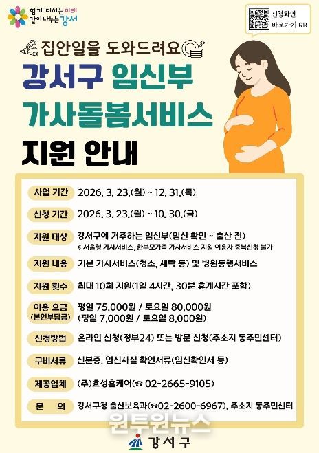 구 관계자는 “임신부들이 가사 노동 부담을 덜고, 태교와 건강 관리에 집중할 수 있도록 지원을 확대했다”며, “앞으로도 저출산 극복과 아이 키우기 좋은 강서구를 만들기 위해 실질적인 복지 정책을 지속 발굴하겠다”고 말했다.