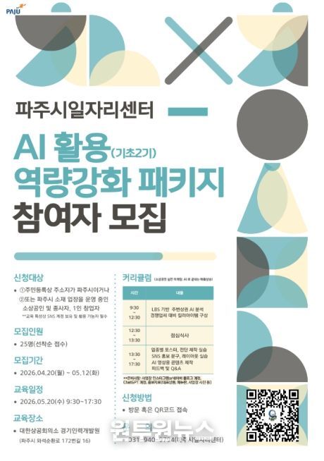 모집 기간은 4월 20일부터 5월 12일까지이며, 교육은 5월 20일 경기인력개발원에서 하루 7시간 과정으로 진행된다. 모집 대상은 파주시 관내 소상공인으로, 총 25명을 선착순 모집한다. 자세한 사항은 파주시청 누리집을 참고하거나 파주시 일자리센터로 문의하면 상세히 안내받을 수 있다.