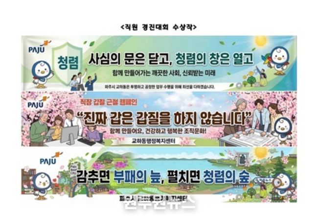(원투원뉴스) 파주시 교하동은 지난 17일, 교하동 행정복지센터에서 소속 직원들을 대상으로 청렴 의식을 높이고 다가오는 지능정보화 시대에 발맞춘 인공지능(AI) 활용 역량을 강화하기 위해 ‘인공지능(AI) 청렴 현수막 경진대회’를 개최했다.