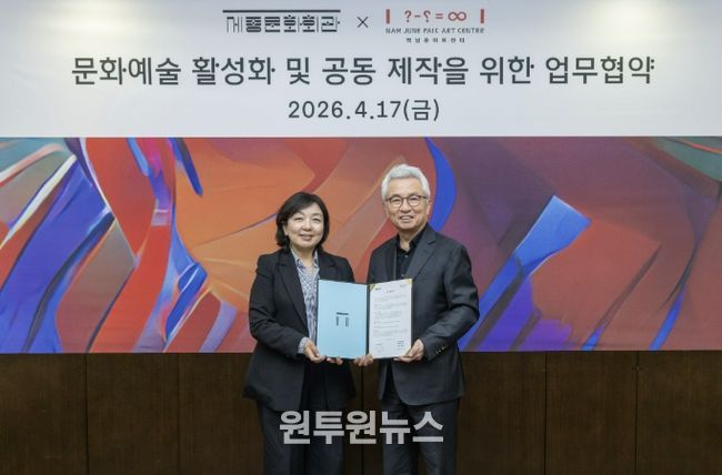 (원투원뉴스) 경기문화재단 백남준아트센터와 재단법인 세종문화회관은 4월 17일, 동시대 예술의 담론 확장과 지속가능한 창작 생태계 조성을 위한 업무협약(MOU)을 체결했다. 이번 협약은 양 기관의 상호존중과 신뢰를 바탕으로, 서울과 경기 지역을 연결하는 광역 문화권 공동제작 모델을 구축하기 위한 협력의 출발점으로 마련됐다.