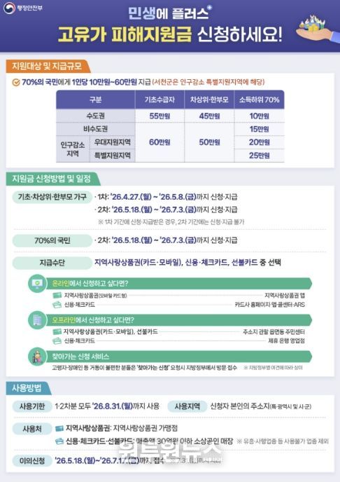 1차 신청(기초·차상위·한부모)은 오는 4월 27일부터 5월 8일까지 진행되며, 2차 신청(소득하위 70%)은 5월 18일부터 7월 3일까지 접수한다.