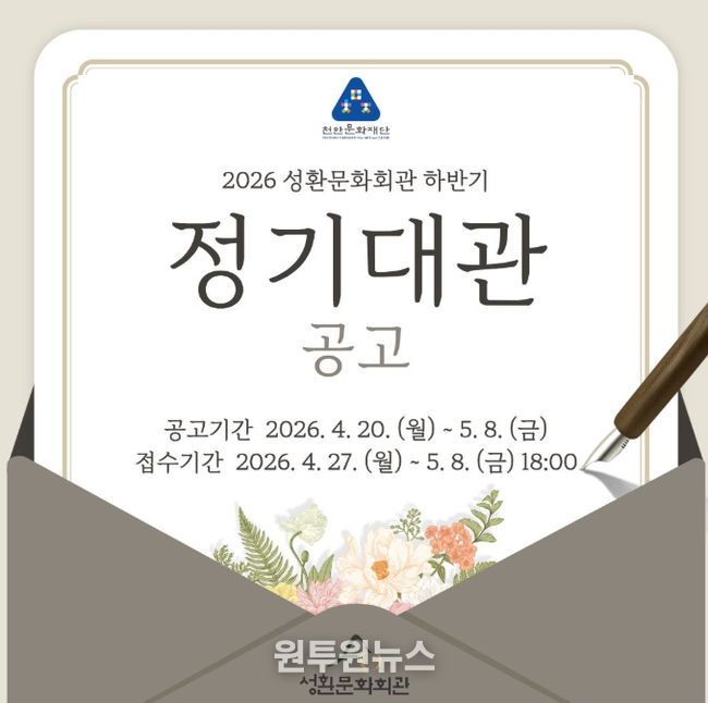 신청은 성환문화회관 누리집에서 가능하며, 선정 결과는 내달 15일 확인할 수 있다.