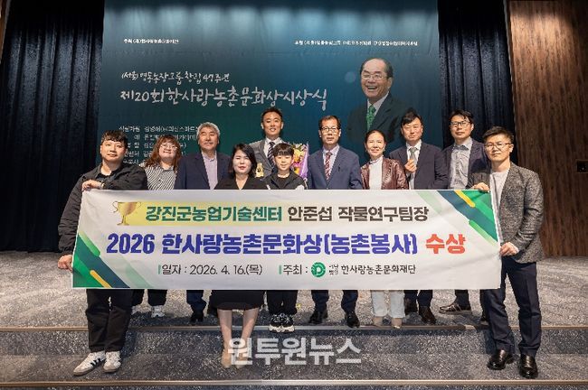 (원투원뉴스) 강진군은 한사랑농촌문화재단이 주관하는 ‘한사랑농촌문화상’ 농촌봉사 부문에서 강진군 농업기술센터 안준섭 작물연구팀장이 수상의 영예를 안았다고 20일 밝혔다.