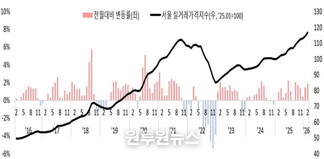 한편, 한국부동산원이 매주 조사·공표하는 주간 아파트 가격지수는 2월 당시 상승세가 점차 둔화되는 모습을 보였으나, 2월 실거래 전수를 기반으로 산출한 실거래가격지수는 오히려 1월 대비 상승폭이 확대된 것으로 나타나 두 지수 간 상이한 흐름이 확인됐다.