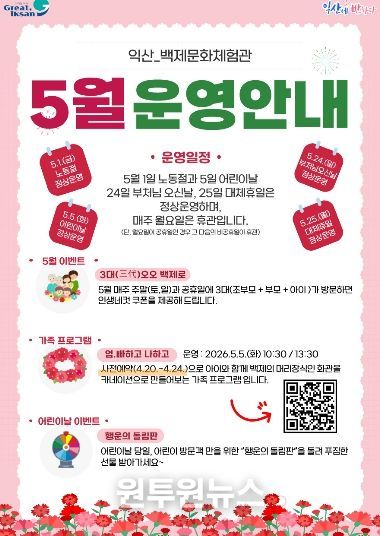 (원투원뉴스) 익산시는 백제문화체험관에서 5월 가정의 달을 맞아 체험 프로그램과 이벤트를 운영한다고 20일 밝혔다.