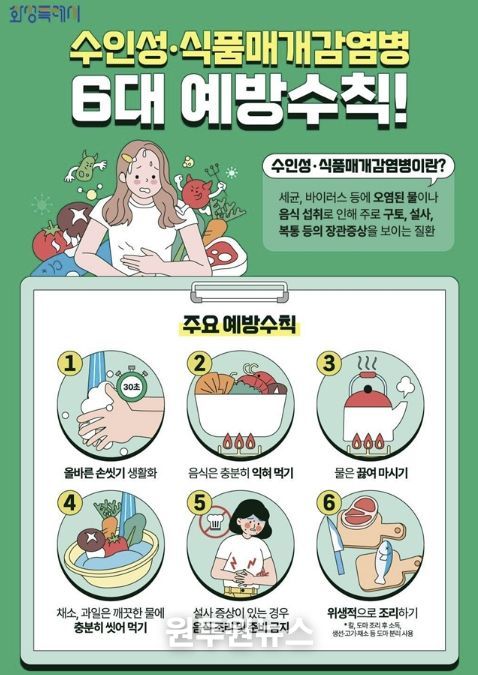 (원투원뉴스) 화성특례시는 최근 아침저녁으로 일교차가 큰 날씨가 이어지는 가운데, 낮 동안에는 기온이 오르고 다습한 환경이 조성되면서 수인성·식품매개감염병 발생 위험이 늘어나고 있다며 시민들의 각별한 주의를 당부했다.