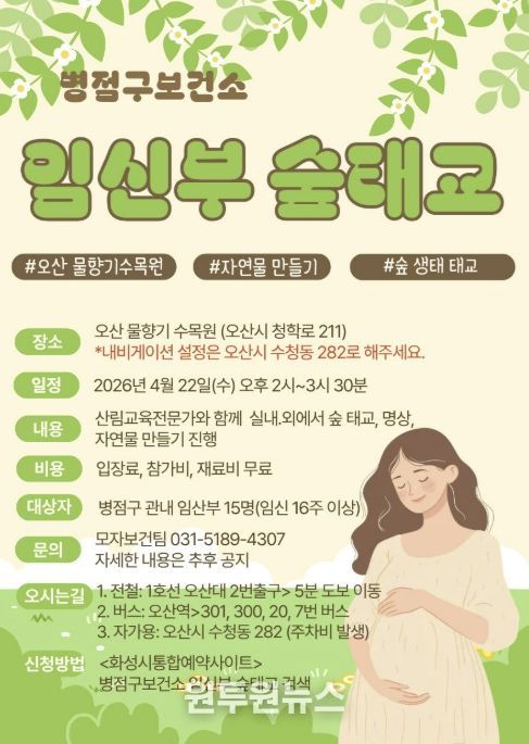 (원투원뉴스) 화성특례시 병점구보건소는 임신부의 정서적 안정과 건강한 출산을 지원하기 위해 오는 22일 ‘임신부 숲태교 프로그램’을 운영한다고 밝혔다.