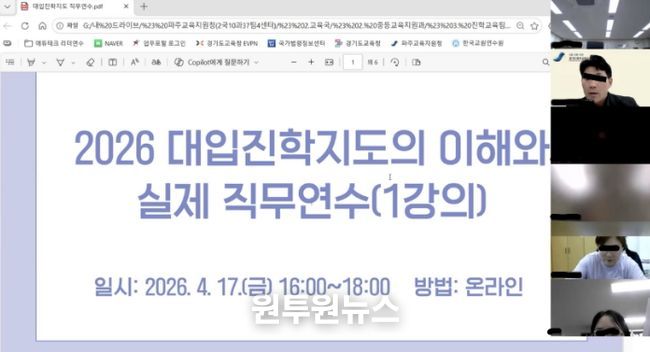 (원투원뉴스) 경기도파주교육지원청은 급변하는 대입 환경에 발맞추어 교원의 대입진학지도 전문성을 높이고 학생 맞춤형 진학 교육을 실현하기 위하여 '2026 대입진학지도의 이해와 실제 직무연수'를 운영한다.