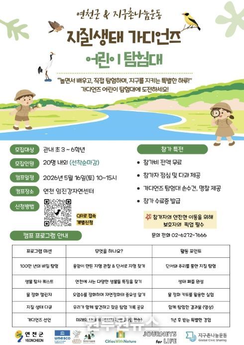 연천군이 주최하고 국제개발협력 NGO 지구촌나눔운동이 주관하는 이번 캠프는 오는 5월 16일 토요일에 진행될 예정이며, 참가 학생들이 연천의 대표적인 지질·생태 자원을 직접 탐사하고 체험하는 과정을 통해 지역의 가치를 이해하고 환경 보전의 중요성을 배울 수 있도록 마련됐다.