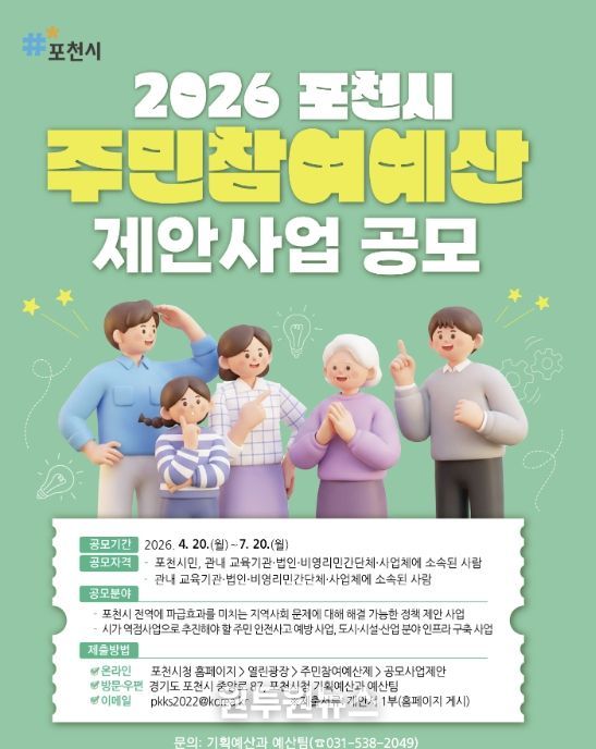 (원투원뉴스) 포천시가 4월 20일부터 오는 7월 20일까지 2027년도 예산편성을 위한 주민참여예산 공모제안사업을 접수하고 있다.