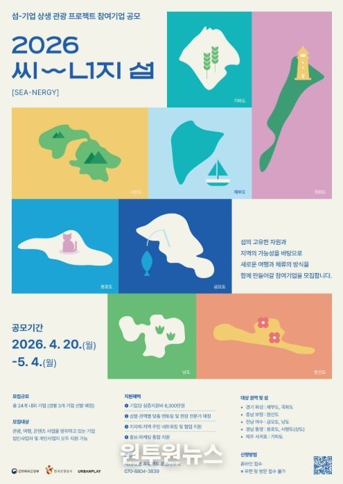 (원투원뉴스) 문화체육관광부가 주최하고 한국관광공사가 주관한 2026년 씨너지『섬-기업 상생 관광프로젝트』 참여기업 공모를 오는 4월 20일 월요일 부터 5월 4일 월요일까지 모집한다.