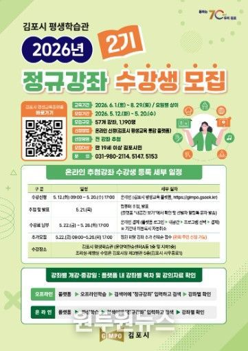 (원투원뉴스) 김포시가 시민의 평생학습 참여 기회를 확대하고 변화하는 사회 환경에 대응할 수 있는 역량 강화를 위해 ‘2026년 2기 평생교육 정규강좌’ 수강생을 모집한다고 밝혔다.