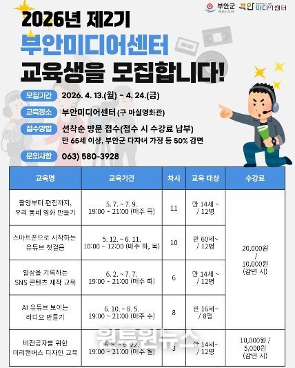 (원투원뉴스) 부안미디어센터는 군민의 미디어 활용 역량 강화를 위해 2026년 제2기 미디어 교육 교육생을 모집한다고 밝혔다.