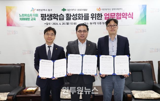 (원투원뉴스) 대전 동구는 20일 대전대학교 RISE사업단‧대전시치매센터와 ‘느린학습자 평생교육 지원’과 ‘치매예방 프로그램 운영’을 위한 업무협약을 체결했다고 밝혔다.