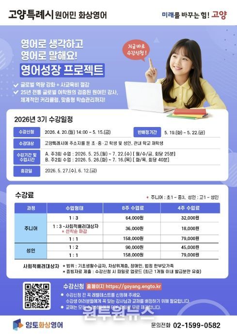 (원투원뉴스) 고양특례시는 글로벌 역량 강화와 사교육비 부담 완화를 위한 ‘원어민 화상영어’ 프로그램의 3기 수강생을 4월 20일부터 5월 15일까지 모집한다.
