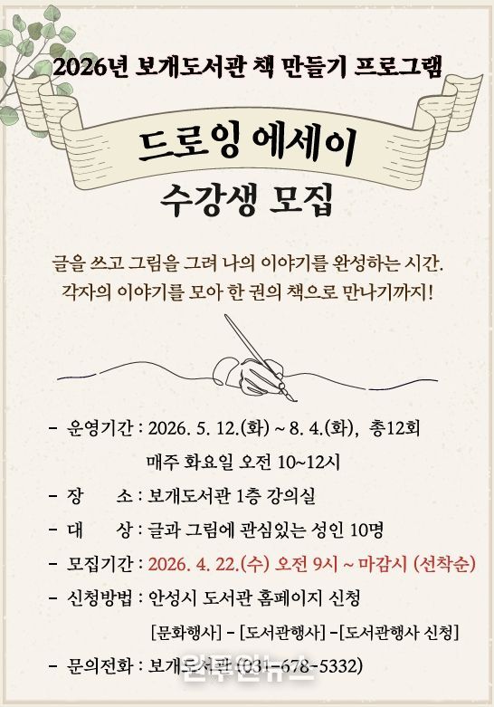 황선경(호아) 그림책 작가의 지도로 5월 12일부터 8월 4일까지 매주 화요일(총 12회) 진행된다. 수강생들은 글과 그림으로 자신의 이야기를 담은 짧은 에세이를 완성하고, 이를 모아 한 권의 책으로 제작하는 전 과정을 경험하게 된다. 정서적 위로와 창작의 기쁨을 동시에 누릴 수 있는 과정으로, 성인 10명을 선착순 모집한다. 4월 22일 수요일 오전 9시부터 안성시 도서관 홈페이지에서 신청할 수 있다.