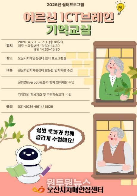 (원투원뉴스) 오산시치매안심센터는 오는 4월 29일부터 경증 치매환자를 위한 쉼터 프로그램 ‘ICT 브레인 기억 교실’을 운영한다고 밝혔다.