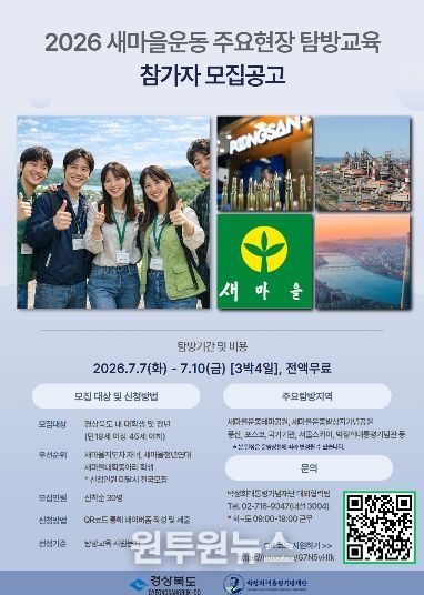 (원투원뉴스) 경상북도와 박정희대통령기념재단은 청년세대의 새마을운동에 대한 이해도를 높이고 가치 확산을 위해 ‘2026 새마을운동 주요현장 탐방교육’을 운영하고 참가자를 모집한다.