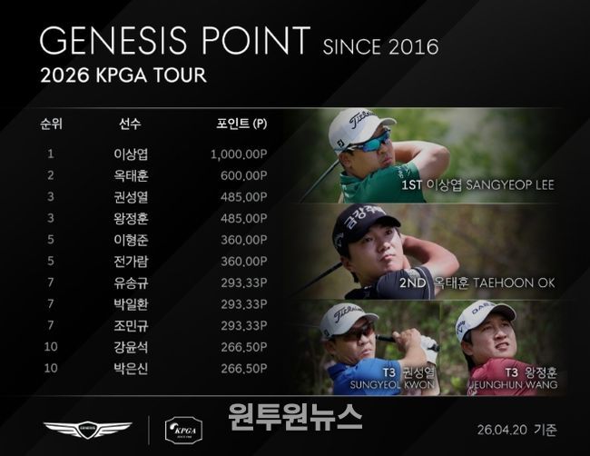 권성열(40)과 왕정훈(31.DAEJIN)이 485포인트로 제네시스 포인트 3위, 이형준(34.웰컴저축은행), 전가람(31.LS)이 360포인트로 제네시스 포인트 5위에 이름을 올렸다.