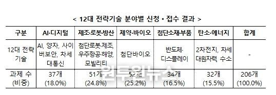 이번 공모는 12대 전략기술 분야를 중심으로 진행된 이번 공모는, 5대 전략기술 그룹 단위로는 제약·바이오 분야에 52개(25.2%), 제조·로봇·방산에 51개(24.8%), 인공지능(이하 AI)·디지털에 37개(18.0%) 등이 접수됐으며, 총 206개 접수 과제에 1,183개 기업·연구소 등이 참여 신청했다.