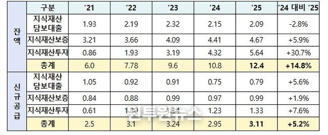 지식재산 금융 잔액은 ’24년 말 10.8조원에서 ’25년 말 12.4조원으로 증가하여 전년대비 14.8% 성장했다. 2025년 지식재산 금융 신규공급은 총 3.1조원으로, 2024년 2.95조원 대비 5.2% 증가했다.