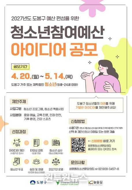 (원투원뉴스) 서울 도봉구가 ‘청소년참여예산제’ 아이디어 공모를 오는 5월 14일까지 진행한다.