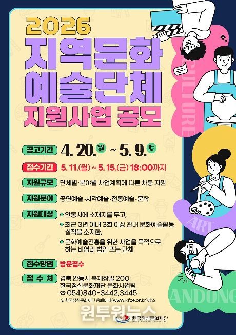 (원투원뉴스) 안동시 한국정신문화재단은 5월 11일부터 5월 15일 18시까지 관내 문화예술단체를 대상으로 ‘지역문화예술단체 지원사업’ 참여단체를 공개 모집한다.