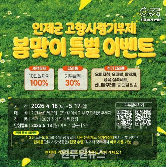 김장웅 인제군 지역발전과장은 “봄철 인제군을 찾는 방문객들에게 고향사랑기부제를 자연스럽게 알리고 참여를 독려하기 위해 이번 이벤트를 마련했다”며, “고향을 사랑하는 마음으로 기부하고 세액공제와 답례품 혜택은 물론, 지역 농특산물 소비 활성화에도 동참하는 뜻깊은 기회가 되길 바란다”고 말했다.