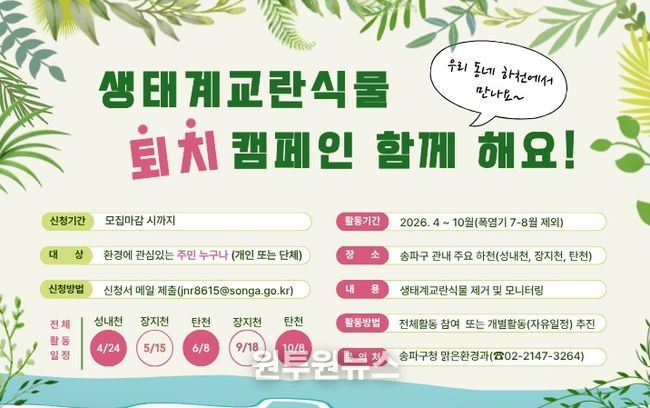 송파구는 4월 24일부터 10월까지 성내천·장지천·탄천 일대에서 ‘생태계교란식물 퇴치 캠페인’을 진행한다. 이번 활동은 지구의 날을 기점으로 송파구시설관리공단과 환경단체, 주민이 함께하는 민관 협력 방식으로 운영된다.
