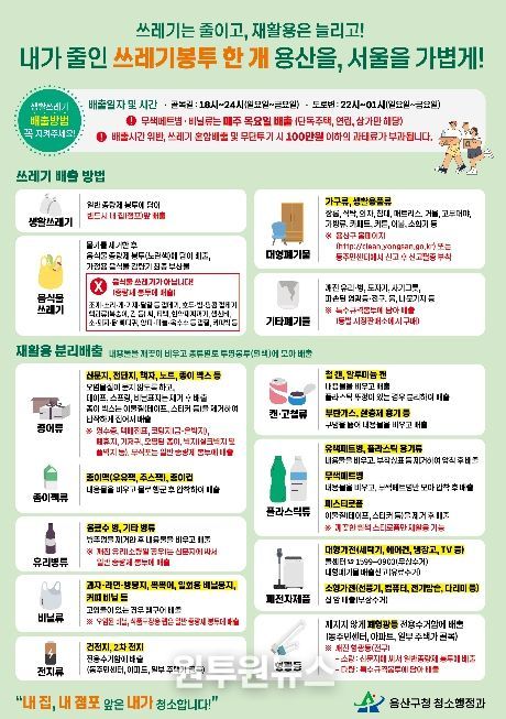 (원투원뉴스) 서울 용산구가 주민 누구나 생활쓰레기 분리배출 정보를 쉽게 이해하고 실천할 수 있도록 주요 배출 정보를 한 장에 담은 안내문을 제작·배포한다.